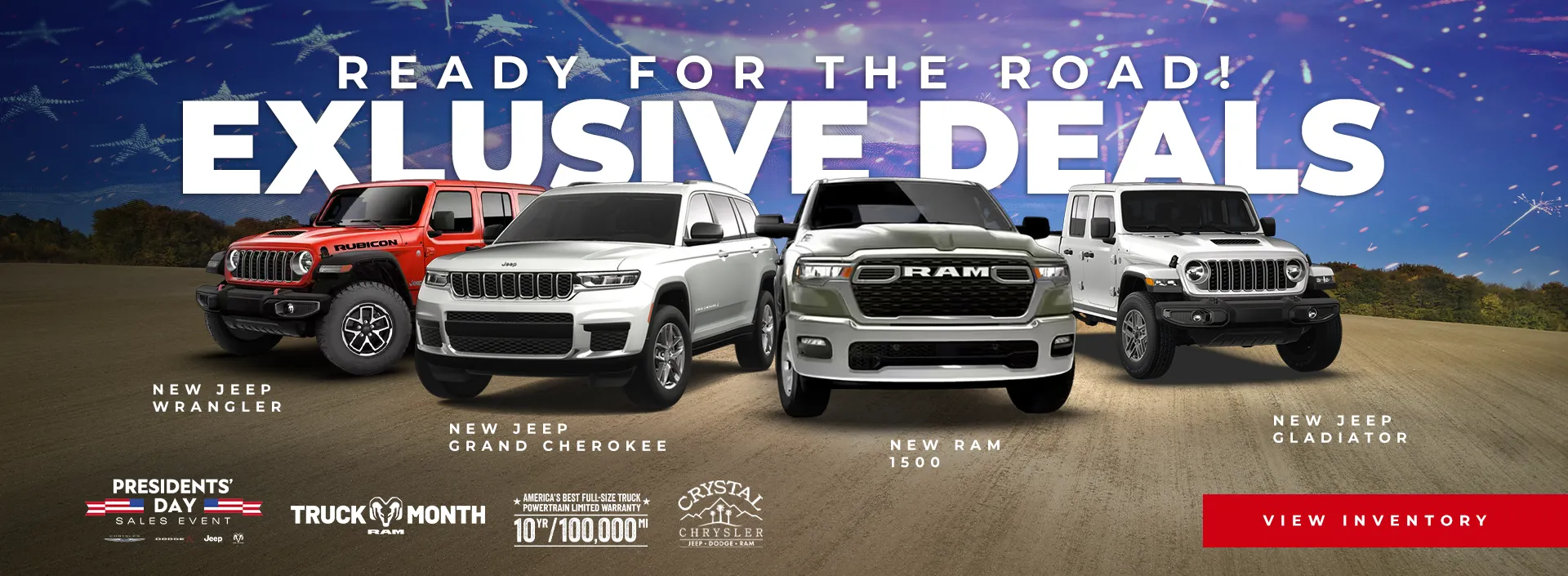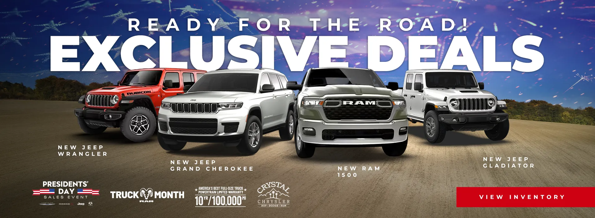 Do you ask yourself what’s my vehicle worth? You can value your trade-in and then trade-in your vehicle with us. We encourage you to browse our online inventory, schedule a test drive and investigate lease deals and financing options. You can also request more information about a vehicle using our online form or by calling 888-703-1694. If you don’t see a particular vehicle, click on CarFinder and complete the form. We will gladly inform you when a matching car arrives. If you’d like to see a vehicle in person, click on Dealership: Directions for step-by-step driving instructions to our site, or give us a call. We look forward to serving you! Check out the newest models in our inventory: Chrysler Pacifica Hybrid, Grand Wagoneer, Wagoneer, Jeep Compass, Jeep Grand Cherokee L, Jeep Gladiator, Jeep Compass, Jeep Cherokee , Jeep Grand Cherokee, Jeep Renegade, Dodge Charger, Dodge Challenger, Ram 2500, Ram ProMaster, and Ram 1500.