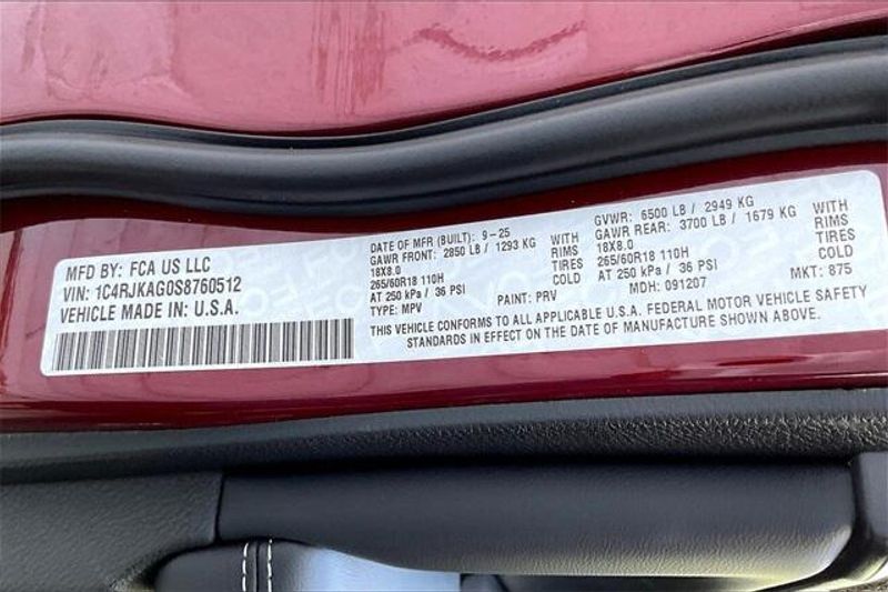 Luxury Tech Group I (115V Auxiliary Power Outlet, 3rd Row Charge-Only USB Ports, Heated Front Seats, Heated Steering Wheel, Power Liftgate, Rain Sensitive Windshield Wipers, Remote Start System, Selectable Tire Fill Alert, and Wireless Charging Pad), Quick Order Package 23D Laredo X (Laredo X and Power Sunroof), 2nd Row 60/40 Bench w/Manual Tip/Slide, 2nd Row Seat Center Armrest/Cupholders, 3 Rear Seat Head Restraints, 3.45 Rear Axle Ratio, 3rd row seats: split-bench, 4-Wheel Disc Brakes, 6 Speakers, 7-Passenger Seating, ABS brakes, Air Conditioning, Alloy wheels, AM/FM radio: SiriusXM, Anti-whiplash front head restraints, Automatic temperature control, Brake assist, Bumpers: body-color, Center Rear 3-Point Seat Belt, Cloth Seats, Compass, Delay-off headlights, Driver door bin, Driver vanity mirror, Dual front impact airbags, Dual front side impact airbags, Electronic Stability Control, Emergency communication system, Four wheel independent suspension, Front anti-roll bar, Front Bucket Seats, Front Center Armrest w/Storage, Front dual zone A/C, Front License Plate Bracket, Front reading lights, Fully automatic headlights, Heated door mirrors, Illuminated entry, Knee airbag, Low tire pressure warning, Manual Fold Seatbacks, Model Year Tracking, Normal Duty Suspension, Occupant sensing airbag, Outside temperature display, Overhead airbag, Overhead console, Panic alarm, ParkView Rear Back-Up Camera, Passenger door bin, Passenger vanity mirror, Power door mirrors, Power driver seat, Power steering, Power windows, Radio data system, Radio: Uconnect 5 w/8.4'' Display, Rear air conditioning, Rear anti-roll bar, Rear reading lights, Rear window defroster, Rear window wiper, Reclining 3rd row seat, Remote keyless entry, Security system, Speed control, Speed-Sensitive Wipers, Split folding rear seat, Spoiler, Steering wheel mounted audio controls, Tachometer, Telescoping steering wheel, Tilt steering wheel, Traction control, Trip computer, Variably intermittent wipers, Voltmeter, and Wheels: 18'' x 8.0'' Fully Painted Aluminum.