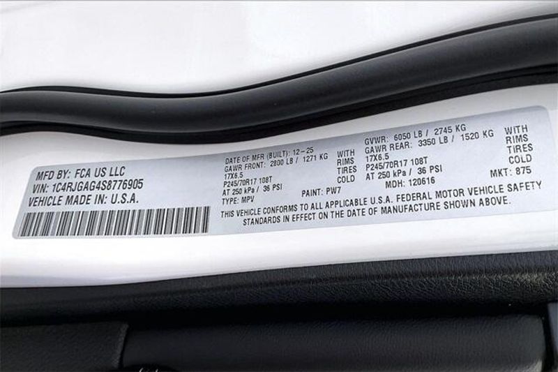 Quick Order Package 23A Laredo, 4-Wheel Disc Brakes, 6 Speakers, ABS brakes, Air Conditioning, Alloy wheels, AM/FM radio: SiriusXM, Anti-whiplash front head restraints, Automatic temperature control, Brake assist, Bumpers: body-color, Cloth Seats, Compass, Delay-off headlights, Driver door bin, Driver vanity mirror, Dual front impact airbags, Dual front side impact airbags, Electronic Stability Control, Emergency communication system, Four wheel independent suspension, Front anti-roll bar, Front Bucket Seats, Front Center Armrest w/Storage, Front dual zone A/C, Front License Plate Bracket, Front reading lights, Fully automatic headlights, Heated door mirrors, Illuminated entry, Knee airbag, Low tire pressure warning, Model Year Tracking, Normal Duty Suspension, Occupant sensing airbag, Outside temperature display, Overhead airbag, Overhead console, Panic alarm, ParkView Rear Back-Up Camera, Passenger door bin, Passenger vanity mirror, Power door mirrors, Power driver seat, Power steering, Power windows, Radio data system, Radio: Uconnect 5 with 8.4'' Display, Rear anti-roll bar, Rear reading lights, Rear window defroster, Rear window wiper, Remote keyless entry, Security system, Speed control, Speed-Sensitive Wipers, Split folding rear seat, Spoiler, Steering wheel mounted audio controls, Tachometer, Telescoping steering wheel, Tilt steering wheel, Traction control, Trip computer, Variably intermittent wipers, Voltmeter, and Wheels: 17'' x 6.5'' Fully Painted Aluminum.