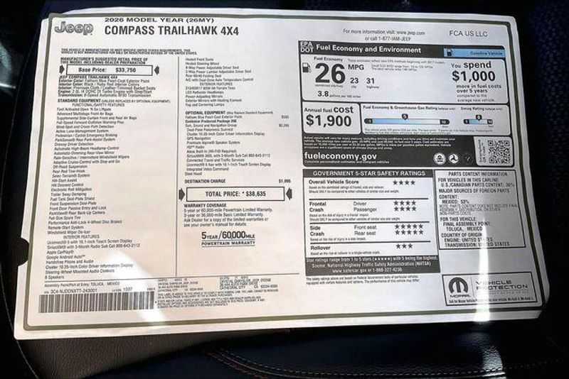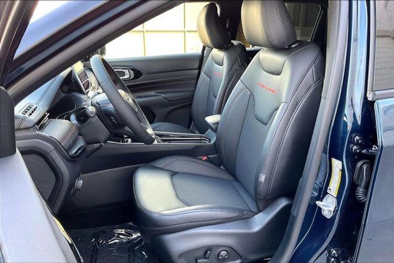 Quick Order Package 29E, Sun, Sound and Navigation Group (10.1'' Touchscreen Display, Alexa Built-In, Cluster 10.25'' TFT Color Display, Connected Travel and Traffic Services, GPS Navigation, HD Radio, Integrated Voice Command with Bluetooth, Power Front/Fixed Rear Full Sunroof, Premium Alpine Speaker System, and SiriusXM with 360L), 4WD, 4-Wheel Disc Brakes, 4.398 Final Drive Ratio, 4G LTE Wi-Fi Hot Spot, 6 Speakers, ABS brakes, Air Conditioning, Alloy wheels, AM/FM radio: SiriusXM, Auto High-beam Headlights, Auto-dimming Rear-View mirror, Automatic temperature control, Brake assist, Bumpers: body-color, Compass, Delay-off headlights, Driver door bin, Driver vanity mirror, Dual front impact airbags, Dual front side impact airbags, Electronic Stability Control, Emergency communication system: SiriusXM Guardian, Four wheel independent suspension, Front anti-roll bar, Front Bucket Seats, Front Center Armrest w/Storage, Front dual zone A/C, Front fog lights, Front License Plate Bracket, Front reading lights, Fully automatic headlights, Global Telematics Box Module, Heated door mirrors, Heated front seats, Heated steering wheel, Illuminated entry, Knee airbag, Leather Shift Knob, Leather steering wheel, Low tire pressure warning, Occupant sensing airbag, Outside temperature display, Overhead airbag, Overhead console, Panic alarm, ParkView Rear Back-Up Camera, Passenger door bin, Passenger vanity mirror, Power door mirrors, Power driver seat, Power Liftgate, Power steering, Power windows, Premium audio system: UConnect 5, Premium Cloth/Leather Trim Bucket Seats, Radio: Uconnect 5 with 10.1'' Display, Rain sensing wipers, Rear anti-roll bar, Rear seat center armrest, Rear window defroster, Rear window wiper, Remote keyless entry, Security system, SiriusXM Guardian - Included Trail (B), SiriusXM Radio Service, Speed control, Split folding rear seat, Spoiler, Steering wheel mounted audio controls, Tachometer, Telescoping steering wheel, Tilt steering wheel, Traction control, Trip computer, Turn signal indicator mirrors, Variably intermittent wipers, and Wheels: 17'' x 6.5'' Painted Black Aluminum. 4WD.