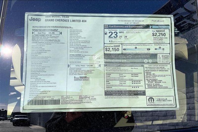Quick Order Package 2BE Limited, 4WD, 10 Speakers, 3.70 Rear Axle Ratio, 4-Wheel Disc Brakes, 4G LTE Wi-Fi Hot Spot, ABS brakes, Active Noise Control System, Air Conditioning, Alloy wheels, AM/FM radio: SiriusXM with 360L, Anti-whiplash front head restraints, Apple CarPlay, AppLink/Apple CarPlay and Android Auto, Audio memory, Auto High-beam Headlights, Automatic temperature control, Auxiliary Battery, Brake assist, Bumpers: body-color, Capri Leatherette Seats, Compass, Connectivity - US/Canada, Delay-off headlights, Disassociated Touchscreen Display, Driver door bin, Driver vanity mirror, Dual front impact airbags, Dual front side impact airbags, Dual-Pane Panoramic Sunroof, Electronic Stability Control, Emergency communication system, For Details, Visit DriveUconnect.com, Four wheel independent suspension, Front anti-roll bar, Front Bucket Seats, Front Center Armrest w/Storage, Front dual zone A/C, Front fog lights, Front License Plate Bracket, Front reading lights, Fully automatic headlights, Garage door transmitter, Global Telematics Box Module (TBM), Gloss Black Exterior Mirrors, Google Android Auto, GPS Antenna Input, Heated door mirrors, Heated Exterior Mirrors, Heated front seats, Heated rear seats, Heated steering wheel, Illuminated entry, Integrated Center Stack Radio, Integrated Voice Command with Bluetooth, Knee airbag, Low tire pressure warning, Manual Folding Exterior Mirrors, Memory seat, Navigation System, Normal Duty Suspension, Occupant sensing airbag, Outside temperature display, Overhead airbag, Overhead console, Panic alarm, ParkView Rear Back-Up Camera, Passenger door bin, Passenger vanity mirror, Power door mirrors, Power driver seat, Power Liftgate, Power passenger seat, Power steering, Power windows, Radio data system, Radio: Uconnect 5 Nav with 12.3'' Display, Rear anti-roll bar, Rear reading lights, Rear window defroster, Rear window wiper, Remote keyless entry, Security system, Speed control, Speed-Sensitive Wipers, Split folding rear seat, Spoiler, Steering wheel mounted audio controls, Tachometer, Telescoping steering wheel, Tilt steering wheel, Traction control, Trip computer, Turn signal indicator mirrors, USB Host Flip, Variably intermittent wipers, Voltmeter, Wheels: 18'' x 8.0'' Polished/Painted Aluminum, and Wheels: 20'' x 8.5'' Machined/Painted AluminuM. 4WD.