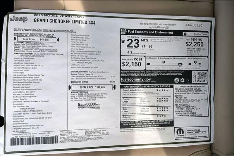 Quick Order Package 2BE Limited, 4WD, 10 Speakers, 3.70 Rear Axle Ratio, 4-Wheel Disc Brakes, 4G LTE Wi-Fi Hot Spot, ABS brakes, Active Noise Control System, Air Conditioning, Alloy wheels, AM/FM radio: SiriusXM with 360L, Anti-whiplash front head restraints, Apple CarPlay, AppLink/Apple CarPlay and Android Auto, Audio memory, Auto High-beam Headlights, Automatic temperature control, Auxiliary Battery, Brake assist, Bumpers: body-color, Capri Leatherette Seats, Compass, Connectivity - US/Canada, Delay-off headlights, Disassociated Touchscreen Display, Driver door bin, Driver vanity mirror, Dual front impact airbags, Dual front side impact airbags, Dual-Pane Panoramic Sunroof, Electronic Stability Control, Emergency communication system, For Details, Visit DriveUconnect.com, Four wheel independent suspension, Front anti-roll bar, Front Bucket Seats, Front Center Armrest w/Storage, Front dual zone A/C, Front fog lights, Front License Plate Bracket, Front reading lights, Fully automatic headlights, Garage door transmitter, Global Telematics Box Module (TBM), Gloss Black Exterior Mirrors, Google Android Auto, GPS Antenna Input, Heated door mirrors, Heated Exterior Mirrors, Heated front seats, Heated rear seats, Heated steering wheel, Illuminated entry, Integrated Center Stack Radio, Integrated Voice Command with Bluetooth, Knee airbag, Low tire pressure warning, Manual Folding Exterior Mirrors, Memory seat, Navigation System, Normal Duty Suspension, Occupant sensing airbag, Outside temperature display, Overhead airbag, Overhead console, Panic alarm, ParkView Rear Back-Up Camera, Passenger door bin, Passenger vanity mirror, Power door mirrors, Power driver seat, Power Liftgate, Power passenger seat, Power steering, Power windows, Radio data system, Radio: Uconnect 5 Nav with 12.3'' Display, Rear anti-roll bar, Rear reading lights, Rear window defroster, Rear window wiper, Remote keyless entry, Security system, Speed control, Speed-Sensitive Wipers, Split folding rear seat, Spoiler, Steering wheel mounted audio controls, Tachometer, Telescoping steering wheel, Tilt steering wheel, Traction control, Trip computer, Turn signal indicator mirrors, USB Host Flip, Variably intermittent wipers, Voltmeter, Wheels: 18'' x 8.0'' Polished/Painted Aluminum, and Wheels: 20'' x 8.5'' Machined/Painted AluminuM. 4WD.