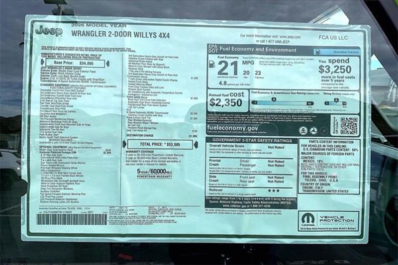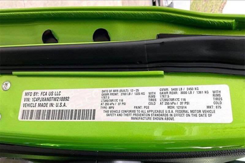 Convenience Group (2-Door Passive Entry, Front Door Locks, Air Conditioning with Auto Temp Control, Air Filtering, Cluster 7.0'' TFT Color Display, Emergency/Assistance Call, Heated Front Seats, Heated Steering Wheel, and Universal Garage Door Opener), Quick Order Package 22W Willys (4-Wheel Drive Swing Gate Decal, 7 and 4 Pin Wiring Harness, Advanced Brake Assist, Automatic Headlamps, Auxiliary Switches, Black Grille with Gloss Black Rings, Class II Receiver Hitch, Conventional Differential Front Axle, Corning Gorilla Glass, Dana M210 Wide HD Tube Front Axle, Dana M220 Wide Rear Axle, Daytime Running Lamps LED Accents, Deep Tint Sunscreen Windows, E-Locker Rear Axle, Enhanced Adaptive Cruise Control, Front LED Fog Lamps, Full Speed Forward Collision Warning Plus, Injection Molded Black Rear Bumper, LED Premium Reflector Headlamps, Mold in Color Bumper with Gloss Black, Molded in Color Rubicon Highline Flare, MOPAR All-Weather Floor Mats, Off-Road Plus Mode, Power Heated Mirrors, Premium Wrapped Steering Wheel, Security Alarm, Sun Visors with Illuminated Vanity Mirrors, Wheels: 17'' x 7.5'' Painted Black, Willy's Suspension, and Willys Hood Decal), Quick Order Package 23W Willys, Safety Group (Auto High Beam Headlamp Control, Blind Spot and Cross Path Detection, LED Taillamps, and ParkSense Rear Park Assist System), Steel Power Dome Hood Package (Power Dome Dual Vented Hood), 12.3'' Touchscreen Display, 4-Wheel Disc Brakes, 4G LTE Wi-Fi Hot Spot, 8 Speakers, ABS brakes, Air Conditioning, AM/FM radio: SiriusXM with 360L, Apple CarPlay, Apple CarPlay/Android Auto, Aux Battery, Black 3-Piece Hard Top, Brake assist, Cloth Low-Back Bucket Seats, Compass, Connectivity - US/Canada, Delay-off headlights, Driver door bin, Driver vanity mirror, Dual front impact airbags, Dual front side impact airbags, Electronic Stability Control, For More Info, Call 800-643-2112, Freedom Panel Storage Bag, Front anti-roll bar, Front Bucket Seats, Front Center Armrest w/Storage, Front fog lights, Front reading lights, Google Android Auto, Illuminated entry, Integrated Center Stack Radio, Integrated roll-over protection, Jeep Trail Rated Kit, Low tire pressure warning, Non-Lock Fuel Cap Without Discriminator, Normal Duty Suspension, Occupant sensing airbag, Outside temperature display, Overhead airbag, Panic alarm, ParkView Rear Back-Up Camera, Passenger door bin, Passenger vanity mirror, Power steering, Power windows, Radio data system, Radio: Uconnect 5 with 12.3'' Display, Rear anti-roll bar, Rear reading lights, Rear Window Defroster, Rear Window Wiper/Washer, Remote keyless entry, SiriusXM Radio Service, SiriusXM with 360L, Speed control, Steering wheel mounted audio controls, Stop-Start Dual Battery System, Tachometer, Telescoping steering wheel, Tilt steering wheel, Traction control, Trip computer, Variably intermittent wipers, and Wheels: 17'' x 7.5'' Black Steel Styled.