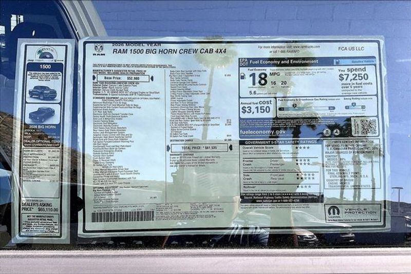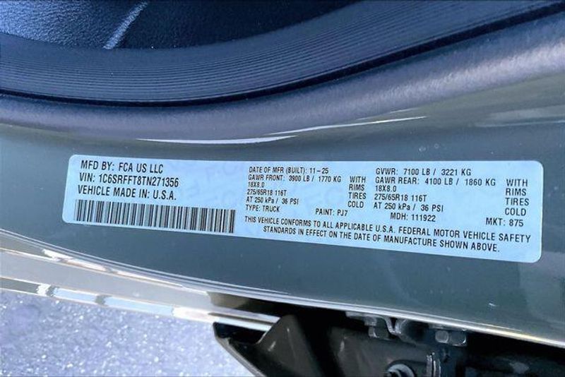 Big Horn Level 1 Equipment Group (115V Auxiliary Power Outlet, 2nd Row in Floor Storage Bins, 3 Rear Seat Head Restraints, 4 Way Front Headrests, 400W Inverter, Auto Power-Folding Mirrors, Auto-Dimming Exterior Driver Mirror, Auto-Dimming Rear-View Mirror, Black Exterior Mirrors, Black Premium Power Mirrors, Body Color Fender Flares, Bucket Seats, Center Console Parts Module, Convex Wide-Angle Exterior Mirror Insert, Deluxe Cloth Bucket Seats, Exterior Mirrors Courtesy Lamps, Exterior Mirrors with Heating Element, Exterior Mirrors with Supplemental Signals, Front Seat Back Map Pockets, Full Length Floor Console, Glove Box Lamp, Heated Front Seats, Heated Steering Wheel, Leather Wrapped Steering Wheel, Manual Adjust 4-Way Front Passenger Seat, Power 2-Way Driver Lumbar Adjust, Power Adjust 8-Way Driver Seat, Power Adjustable Pedals, Rear 60/40 Folding Seat, Rear Center Armrest, Rear Dome with on/Off Switch Lamp, Rear Power Sliding Window, Rear Window Defroster, SiriusXM Radio Service, SiriusXM Satellite Radio, Steering Wheel Mounted Audio Controls, Sun Visors with Illuminated Vanity Mirrors, and Universal Garage Door Opener), Quick Order Package 27Z Big Horn, Sport Appearance Package (Black Interior Accents, Body Color Door Handles, Body Color Front Bumper, Body Color Rear Bumper with Step Pads, Body Color Tailgate Handle, Grille Surround 1 Body Color Texture 1 Black, and RAM Grille Badge - Chrome), 33 Gallon Fuel Tank, 4-Wheel Disc Brakes, 48V Belt Starter Generator, 4G LTE Wi-Fi Hot Spot, 6 Speakers, ABS brakes, Air Conditioning, Alloy wheels, AM/FM radio, Apple CarPlay, Apple CarPlay/Android Auto, Auto High-beam Headlights, Brake assist, Bumpers: chrome, Cloth Bucket Seats, Compass, Connectivity - US/Canada, Delay-off headlights, Driver door bin, Dual front impact airbags, Dual front side impact airbags, Electronic Stability Control, Front anti-roll bar, Front Bucket Seats, Front Center Armrest w/Storage, Front fog lights, Front License Plate Bracket, Front reading lights, Front wheel independent suspension, Fully automatic headlights, Global Telematics Box Module, Google Android Auto, GPS Antenna Input, Heated door mirrors, Illuminated entry, Integrated Center Stack Radio, Integrated Voice Command with Bluetooth, Low tire pressure warning, Manual Adjust 4-Way Driver Seat, Manual Folding Exterior Mirrors, MOPAR Front and Rear Rubber Floor Mats, Occupant sensing airbag, Outside temperature display, Overhead airbag, Overhead console, Panic alarm, ParkView Rear Back-Up Camera, Passenger door bin, Passenger vanity mirror, Power door mirrors, Power steering, Power windows, Radio data system, Radio: Uconnect 5 W with 8.4'' Display, Rear anti-roll bar, Rear step bumper, Remote keyless entry, Speed control, Supplier Part Tracking (J-1), Tachometer, Telescoping steering wheel, Tilt steering wheel, Traction control, Trip computer, USB Host Flip, Variably intermittent wipers, Voltmeter, and Wheels: 18'' x 8'' Cast-Aluminum Painted. Call for updated Price with New Lift and Tires and Wheels