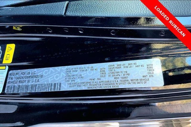 Advanced Safety Group (Advanced Brake Assist, Auto High Beam Headlamp Control, and Full Speed Forward Collision Warning Plus), LED Lighting Group (Daytime Running Lamps LED Accents, Front LED Fog Lamps, LED Premium Reflector Headlamps, and LED Taillamps), Quick Order Package 25R, Safety Group (Blind Spot & Cross Path Detection and ParkSense Rear Park Assist System), Steel Bumper Group (Steel Front Bumper and Steel Rear Bumper), 4-Wheel Disc Brakes, 4.10 Rear Axle Ratio, 8 Speakers, ABS brakes, Air Conditioning, Alloy wheels, Alpine Premium Audio System, AM/FM radio: SiriusXM, Apple CarPlay/Android Auto, Automatic temperature control, Aux Battery, Body Color 3-Piece Hard Top, Body Color Fender Flares, Brake assist, Compass, Delay-off headlights, Driver door bin, Driver vanity mirror, Dual front impact airbags, Dual front side impact airbags, Electronic Stability Control, Front anti-roll bar, Front Bucket Seats, Front Center Armrest w/Storage, Front dual zone A/C, Front fog lights, Front License Plate Bracket, Front reading lights, Fully automatic headlights, Garage door transmitter, Heated door mirrors, Illuminated entry, Integrated roll-over protection, Jeep Trail Rated Kit, Leather steering wheel, Low tire pressure warning, Manufacturer's Statement of Origin, MOPAR Hardtop Headliner, Non-Lock Fuel Cap w/o Discriminator, Occupant sensing airbag, Outside temperature display, Panic alarm, ParkView Rear Back-Up Camera, Passenger door bin, Passenger vanity mirror, Performance Suspension, Power door mirrors, Power steering, Power windows, Premium Cloth Low-Back Bucket Seats, Radio data system, Radio: Uconnect 4 w/7'' Display, Rear anti-roll bar, Rear reading lights, Remote keyless entry, Remote Proximity Keyless Entry, Remote Start System, Security system, Speed control, Split folding rear seat, Steering wheel mounted audio controls, Stop-Start Dual Battery System, Tachometer, Telescoping steering wheel, Tilt steering wheel, Traction control, Trip computer, Variably intermittent wipers, Voltmeter, and Wheels: 17'' x 7.5'' Machined w/Black Pockets.