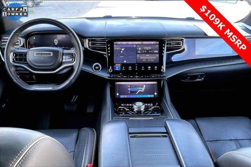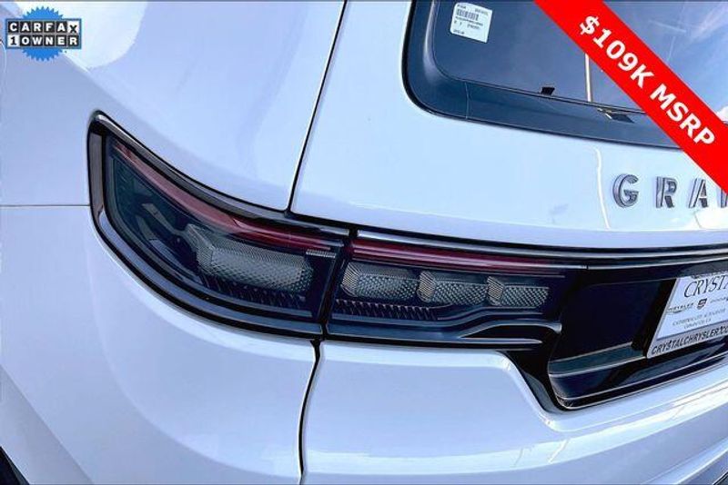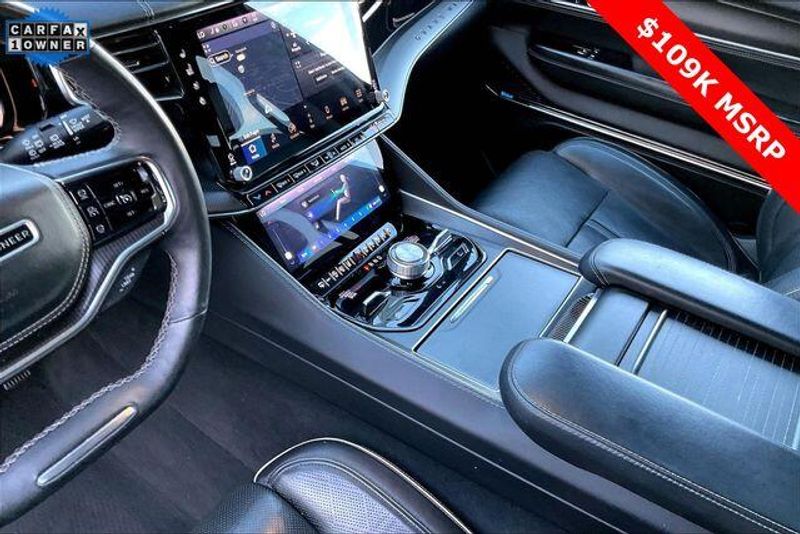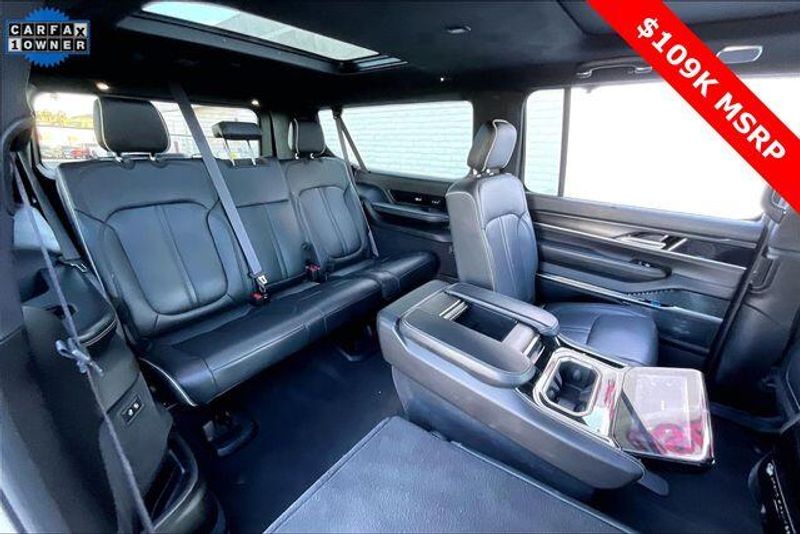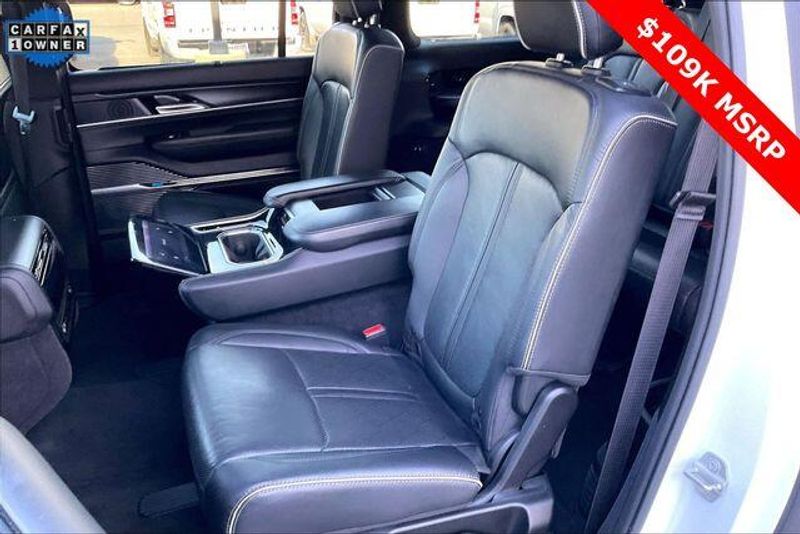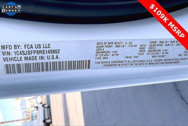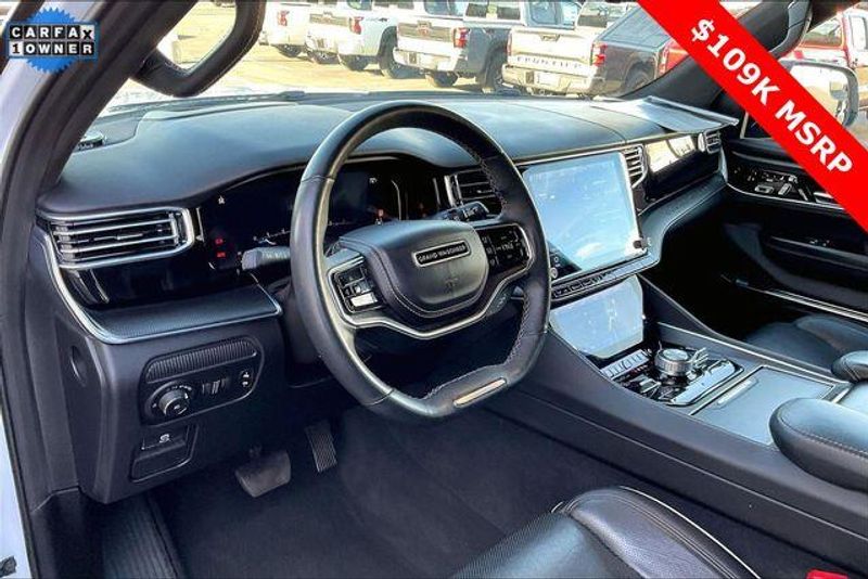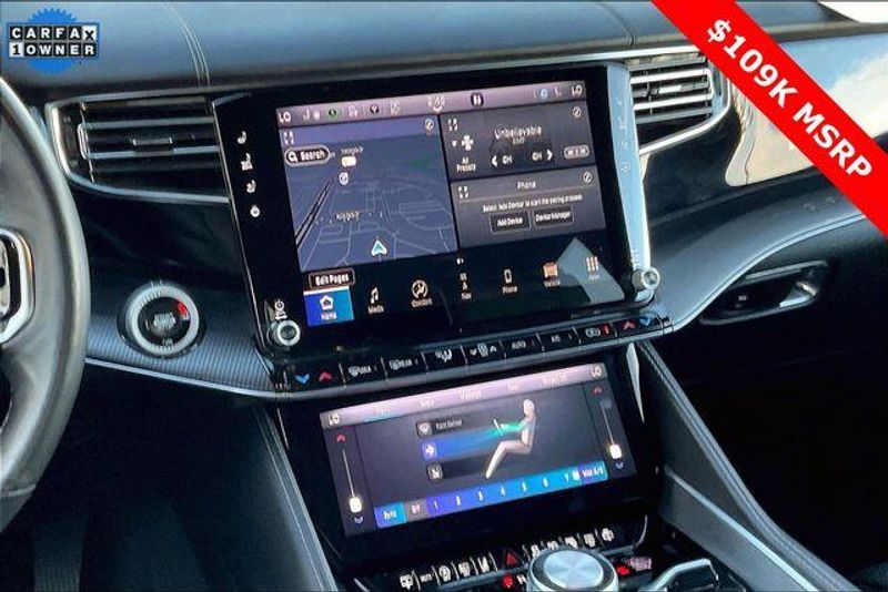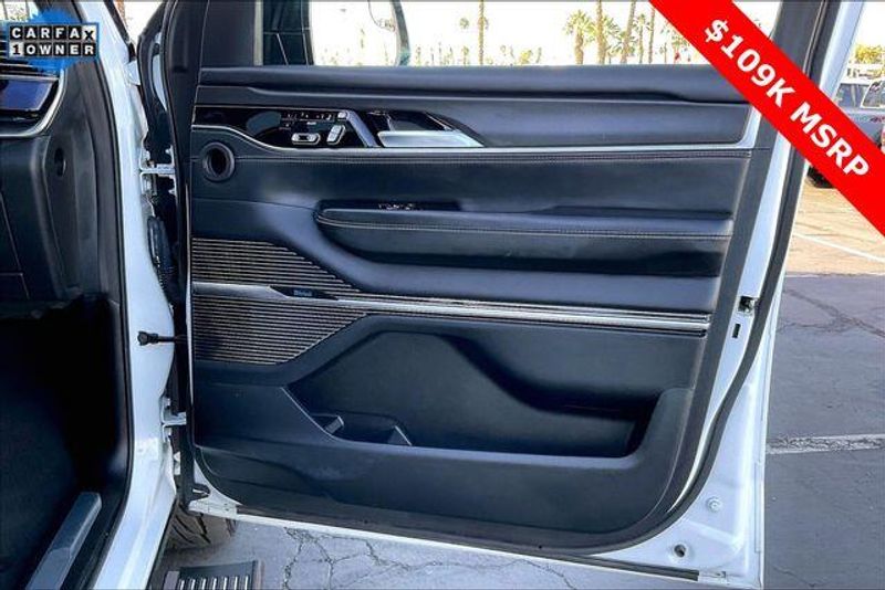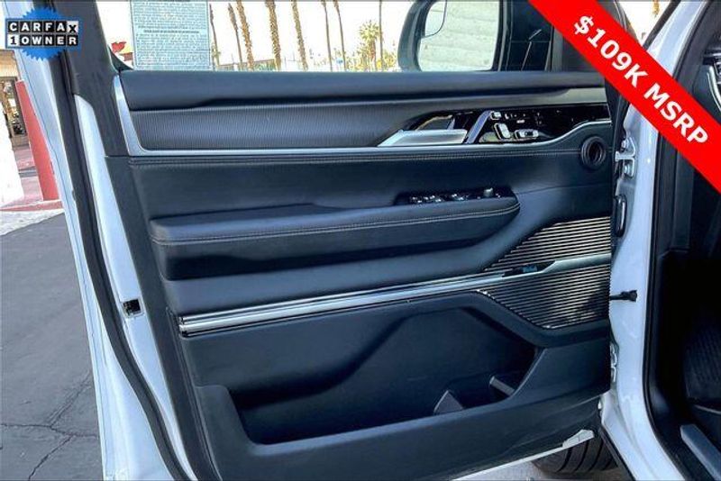Obsidian Appearance Package, Quick Order Package 28T Obsidian (23 Speaker McIntosh Reference Audio System, Adjustable Roof Rail Crossbars, Black Interior Accents, Black Roof, Front Console Cooler, Front Passenger Interactive Display, Gloss Black Upper & Lower DLO Molding, Piano Black Exterior Accents, Rearview Autodim Digital Display Mirror, Ventilated Rear Seats, and Wheels: 22'' x 9.0'' Tinted Polished w/Black Insert), Two Tone Paint Group, Navigation System, 19 Speakers, 3rd row seats: bench, 4-Wheel Disc Brakes, ABS brakes, Adjustable pedals, Air Conditioning, Alloy wheels, AM/FM radio: SiriusXM with 360L, Anti-whiplash front head restraints, Apple CarPlay/Android Auto, Audio memory, Auto High-beam Headlights, Auto-dimming door mirrors, Auto-dimming Rear-View mirror, Auto-leveling suspension, Automatic temperature control, Brake assist, Bumpers: body-color, Compass, Delay-off headlights, Driver door bin, Driver vanity mirror, Driver's Seat Mounted Armrest, Dual front impact airbags, Dual front side impact airbags, Electronic Stability Control, Emergency communication system, Four wheel independent suspension, Front anti-roll bar, Front Bucket Seats, Front Center Armrest w/Storage, Front dual zone A/C, Front fog lights, Front reading lights, Fully automatic headlights, Garage door transmitter, Genuine wood console insert, Genuine wood dashboard insert, Genuine wood door panel insert, Heads-Up Display, Heated door mirrors, Heated front seats, Heated rear seats, Heated steering wheel, Illuminated entry, Knee airbag, Leather steering wheel, Leather Trimmed Bucket Seats, Low tire pressure warning, Memory seat, Normal Duty Suspension, Occupant sensing airbag, Outside temperature display, Overhead airbag, Overhead console, Panic alarm, Passenger door bin, Passenger seat mounted armrest, Passenger vanity mirror, Pedal memory, Power adjustable front head restraints, Power door mirrors, Power driver seat, Power Liftgate, Power moonroof, Power passenger seat, Power steering, Power windows, Radio data system, Radio: Uconnect 5 Nav w/12.0'' Display, Rain sensing wipers, Rear air conditioning, Rear anti-roll bar, Rear dual zone A/C, Rear reading lights, Rear seat center armrest, Rear window defroster, Rear window wiper, Reclining 3rd row seat, Remote keyless entry, Security system, Speed control, Speed-sensing steering, Speed-Sensitive Wipers, Split folding rear seat, Steering wheel memory, Steering wheel mounted audio controls, Tachometer, Telescoping steering wheel, Tilt steering wheel, Traction control, Trip computer, Turn signal indicator mirrors, Variably intermittent wipers, Ventilated front seats, and Voltmeter.